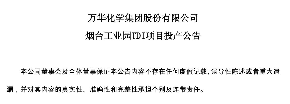 據涂料采購網消息,12月28日晚間,萬華化學發布公告稱,根據國家發展和改革委員會《國家發展改革委關于煙臺萬華聚氨酯股份有限公司老廠搬遷異氰酸酯一體化項目核準的批復》(發改產業[2009]3057 號),萬華化學集團股份有限公司(以下簡稱“公司”)煙臺工業園 30 萬噸/年甲苯二異氰酸酯(TDI)項目于近期竣工投產,產出合格產品。