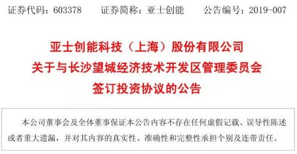2019 年 2 月 21 日與望城經濟技術開發區管理委員會簽訂了《亞士創能科技(華中地區)建筑節能保溫與裝飾材料綜合性生產基地項目入園協議書》及《補充協議書》(以下統稱為“協議”、“投資協議”)。