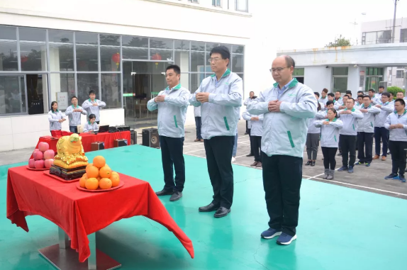 董事長、部門經理代表、員工代表做為三獻人員,帶領全體員工向社徽行三拜禮,感謝天地君親師!