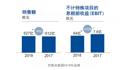 巴斯夫2018年銷售額為627億歐元,同比上升2%。不計特殊項目的息稅前收益降至64億歐元(2017:76億歐元),其中約三分之二的利潤下降由化學品業務領域導致:下半年異氰酸酯利潤急劇下降;此外,2018年各地區裂解裝置利潤也低于預期。
