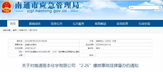 2月27日,南通市應(yīng)急管理局也發(fā)布了:關(guān)于對南通雅本化學(xué)有限公司 “2·26”爆燃事故掛牌督辦的通知