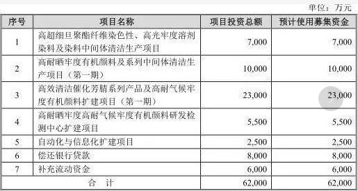 七彩化學上市最終募集資金總額為5.89億元,扣除發行費用4571.73萬元,募集資金凈額為5.44億元,募集資金投資項目為“高超細旦聚酯纖維染色性、高光牢度溶劑染料及染料中間體清潔生產項目”、“高耐曬牢度有機顏料及系列中間體清潔生產項目(第一期)”、“高效清潔催化芳腈系列產品及高耐氣候牢度有機顏料擴建項目(第一期)”、“高耐曬牢度高耐氣候牢度有機顏料研發檢測中心擴建項目”、“自動化與信息化擴建項目”等。
