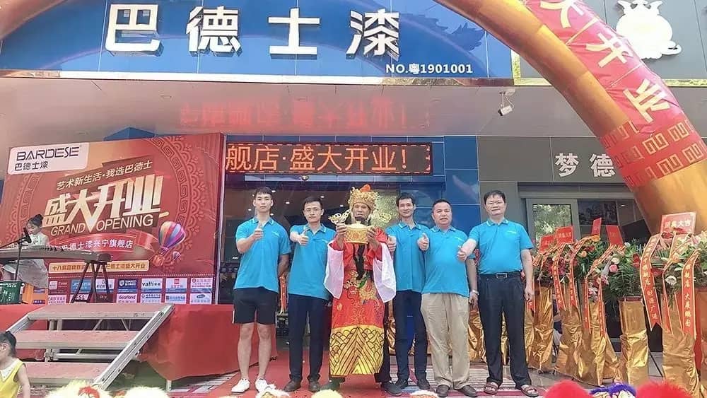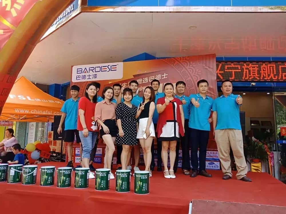 典禮現(xiàn)場(chǎng)彩旗飛舞,鑼鼓喧天,鳳舞龍?bào)矗姆劫e客云集,巴德士集團(tuán)全裝飾涂料事業(yè)營(yíng)銷(xiāo)一部廣東區(qū)李曉明部長(zhǎng)等一行代表公司到場(chǎng)祝賀,與眾賓客共聚一堂,為巴德士藝術(shù)漆入駐廣東興寧擂鼓助威!