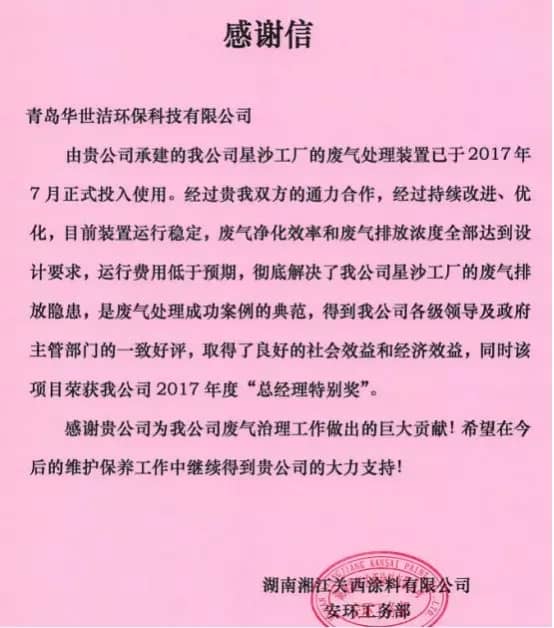 湘江關西涂料感謝信中稱,自華世潔承建湘江關西涂料星沙工廠的廢氣處理裝置投入使用以來,經過持續性改進、優化,目前該裝置運營穩定,廢氣凈化效率和廢氣排放濃度全部達到設計要求,運行費用低于預期,徹底解決了廢氣排放隱患,是廢氣處理成功案例的典范,得到了湘江關西各級領導及政府主管部門的一致好評,取得了良好的社會效益和經濟效益。