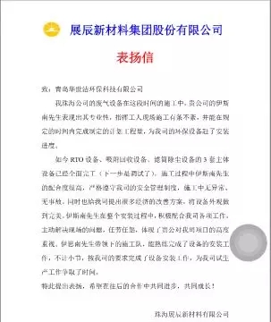 國內建筑涂料龍頭企業之一的展辰新材料集團股份有限公司也對華世潔的產品及服務非常滿意,并給華世潔發來了表揚信稱,在展辰珠海公司的廢氣設備施工過程中,華世潔的伊斯南先生表現出其專業性,指揮工人現場施工有條不紊,并能在規定的時間內完成制定的計劃工程,如今RTO設備、吸附回收設備、濾筒除塵設備的3套主體設備已經全面完工,施工過程中伊斯南先生嚴格遵守展辰的安全管理制度,施工中無異常,無事故。同時也給展辰提出很多經濟的改善方案。