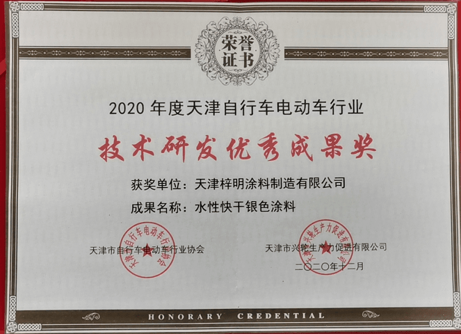 2020年天津自行車電動車行業“技術研發成果獎”、“研發人才獎”評選中,此款產品被天津市自行車電動車行業協會評為“技術研發優秀成里獎”,這個獎項也是對紫明水漆產品的肯定。