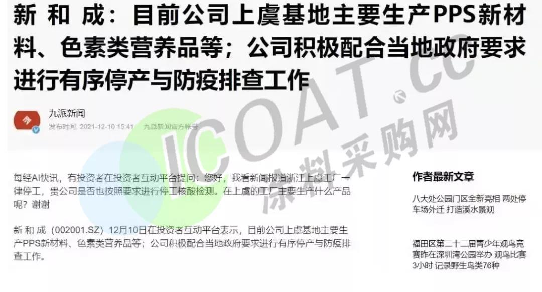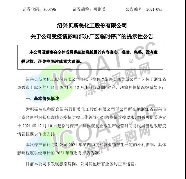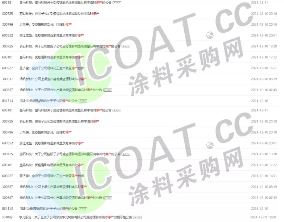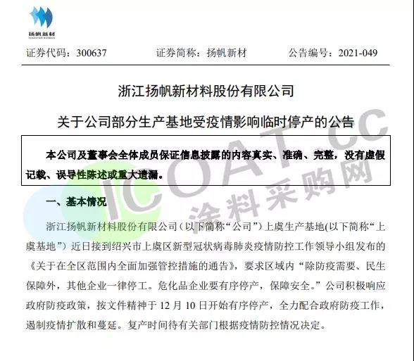 揚帆新材:于12月10日開始有序停產(chǎn),復(fù)產(chǎn)時間待有關(guān)部門根據(jù)疫情防控情況決定,上虞基地主要生產(chǎn)部分光引發(fā)劑產(chǎn)品。臨時停產(chǎn)對公司2021年總體業(yè)績影響相對有限。