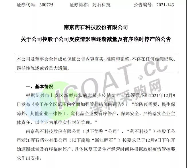 藥石科技:公司控股子公司浙江暉石藥業(yè)有限公司按要求已于12月9日下午開始逐漸減量及有序臨時停產(chǎn),具體恢復(fù)正常生產(chǎn)經(jīng)營時間將根據(jù)政府疫情管控要求作出安排。預(yù)計本次逐漸減量及有序臨時停產(chǎn)將延遲浙江暉石產(chǎn)品的生產(chǎn)和交付,將對浙江暉石經(jīng)營業(yè)績產(chǎn)生一定的不利影響。