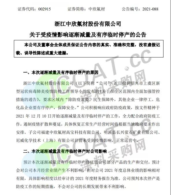 中欣氟材:于2021年12月10日開始逐漸減量及有序臨時停產(chǎn),具體恢復(fù)正常生產(chǎn)經(jīng)營時間將根據(jù)當?shù)卣笞鞒霭才拧?br />