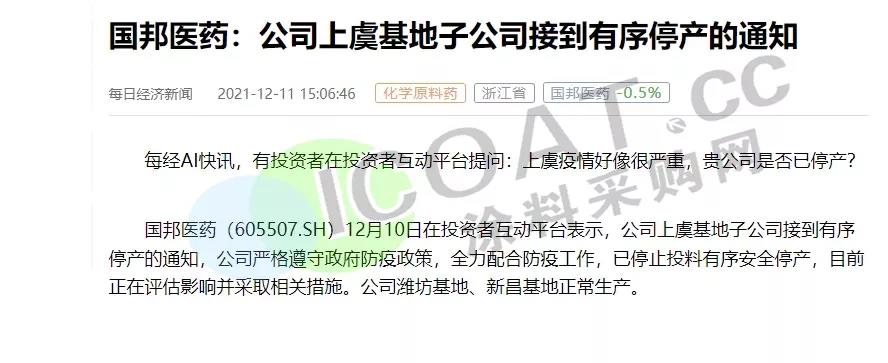 國邦醫(yī)藥:公司上虞基地子公司接到有序停產(chǎn)的通知,已停止投料有序安全停產(chǎn),目前正在評估影響并采取相關(guān)措施。