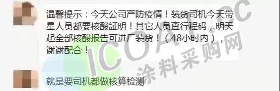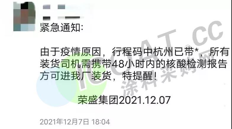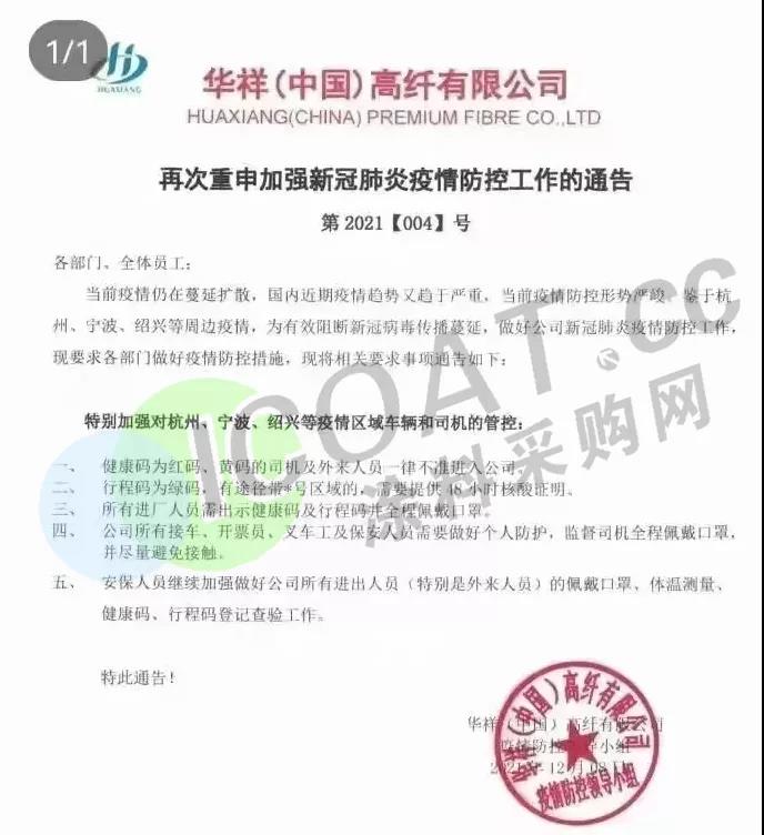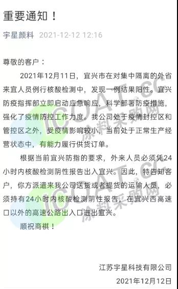 除此之外,江蘇宇星顏料、江蘇三木集團、華祥(中國)高纖有限公司、榮盛集團等當?shù)仄髽I(yè)均提示客戶,由于當?shù)匾咔榉忾],來提貨或送貨的運輸人員,須持有24/48小時內(nèi)核酸檢測陰性報告,并注意選擇特定高速口進出,健康碼為紅碼、黃碼的司機及外來人員一律不準進入。