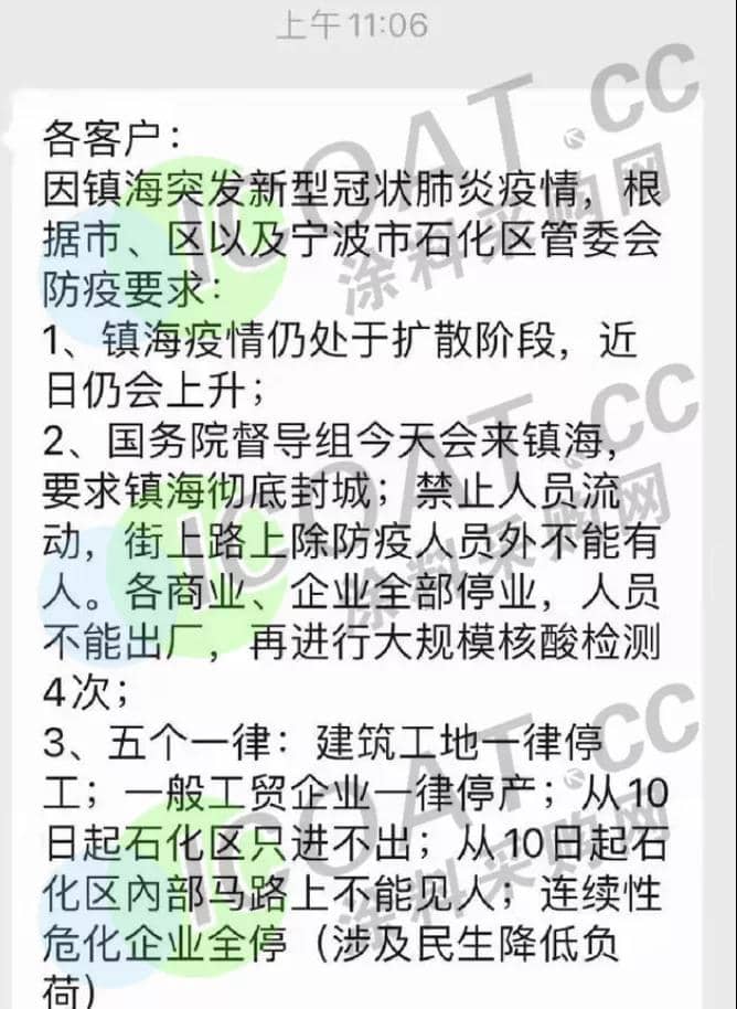 ?寧波鎮(zhèn)海決定在全區(qū)范圍內(nèi)全面升級管控措施,除防疫需要、民生保障外,其他企業(yè)一律停工,石化連續(xù)性生產(chǎn)企業(yè)壓減生產(chǎn)負荷。嚴格落實企業(yè)主體責(zé)任,以企業(yè)為單位實行封閉管理,職工不得出廠。