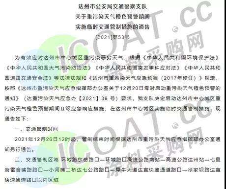 達州:2021年12月26日12時起,在達州市中心城區實施臨時交通管制措施。