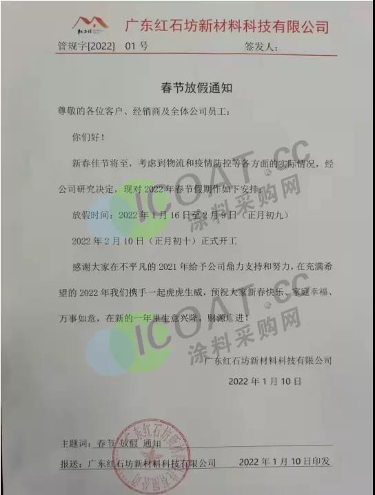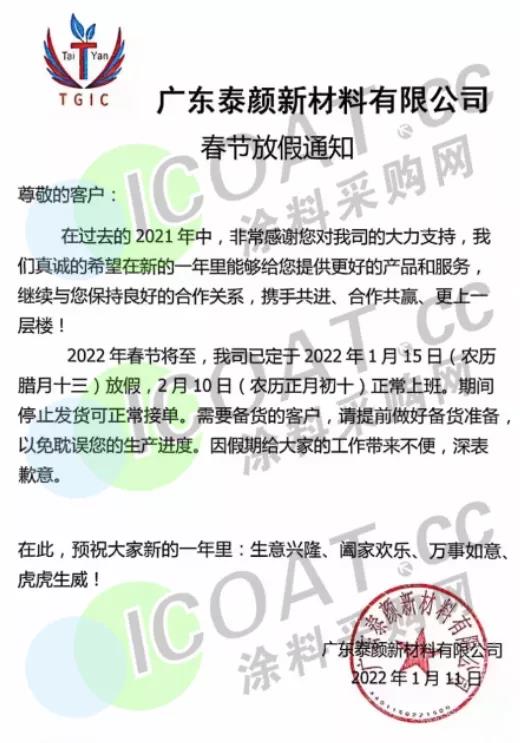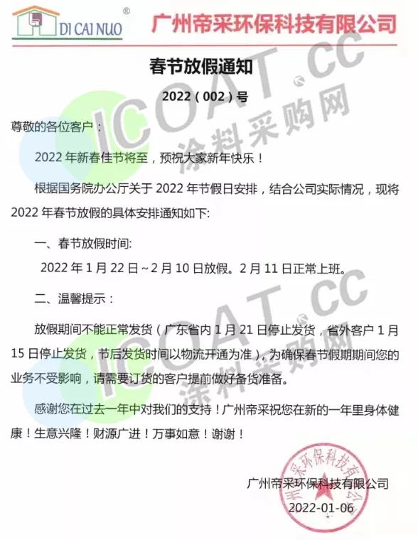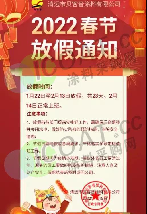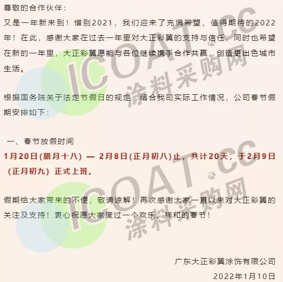 據涂料采購網了解,2022年以來,已有30余家涂料、化工企業發布了放假通知,最早于本月3日已經開始放假,最晚開工時間為2月16日(正月十六),最長放假37天。與往年相比,2022年許多涂料企業的放假提前了不少,且明確放假期間不生產、不發貨、不接單,提醒客戶提早安排備貨事宜。