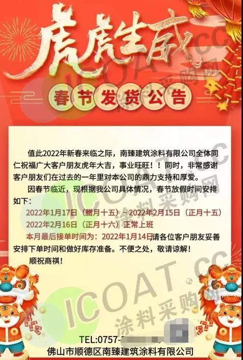 佛山市順德區南臻建筑涂料:2022年1月17日~2022年2月15日放假,2022年2月16日正常上班。最后接單時間為:2022年1月14日。