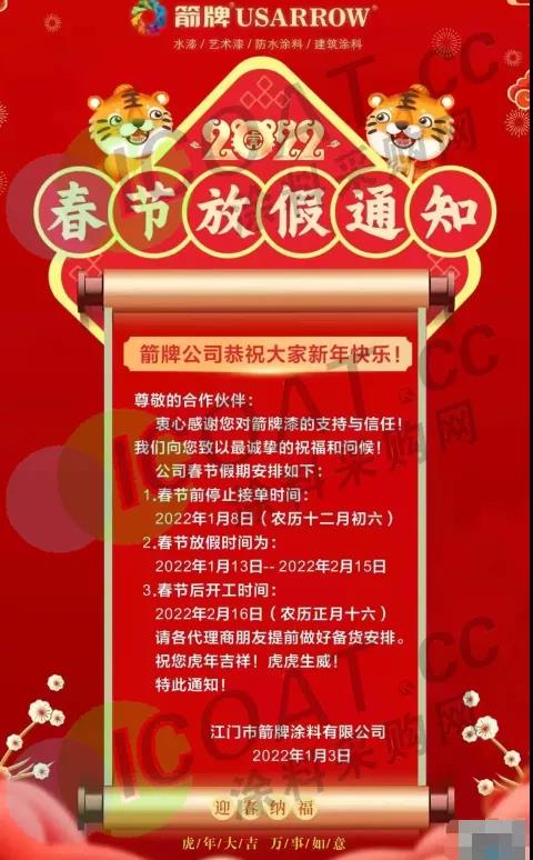 江門市箭牌涂料:春節前停止接單時間:2022年1月8日;春節放假時間為:2022年1月13日--2022年2月15日;春節后開工時間:2022年2月16日。