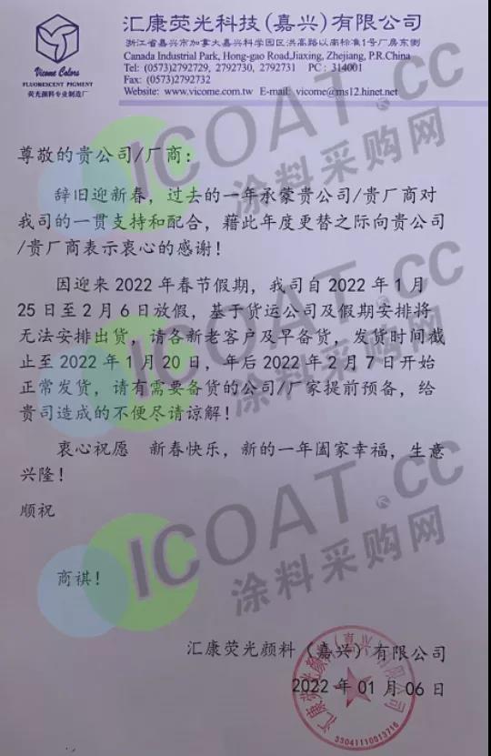 佛山市五福涂料:將于2022年1月16日至2月8日放假調休。1月13日停止接單,2022年2月9日正常營業。