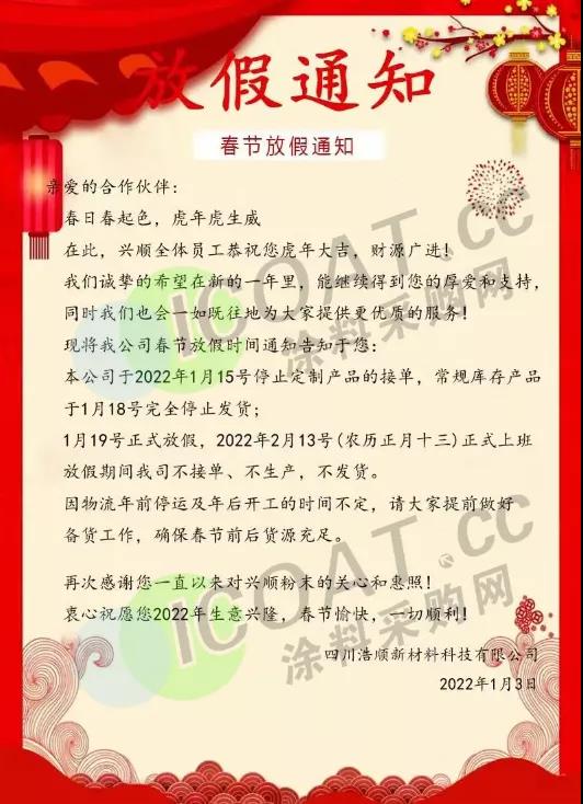 四川省民和鑫新材料科技有限公司:2022年“春節”放假時間為:2022年1月20日至2022年2月9日共計21天,2月10日正式上班。1月15日停止接單,1月18日停止發貨,請各司提前做好備貨準備,以免影響貴司生產,放假期間不安排出貨。