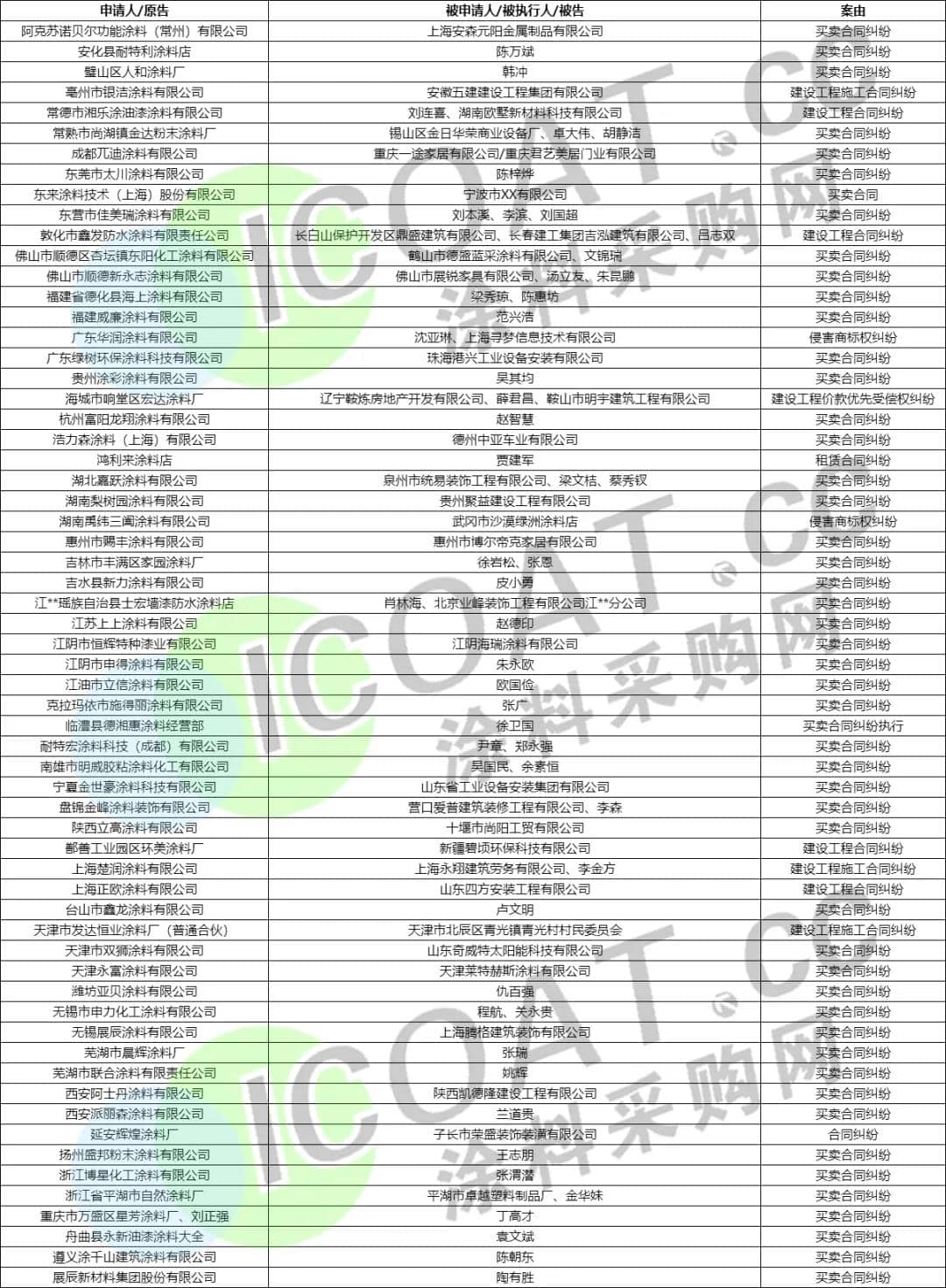 涂料企業(yè)起訴/上訴/申請(qǐng)執(zhí)行的部分官司