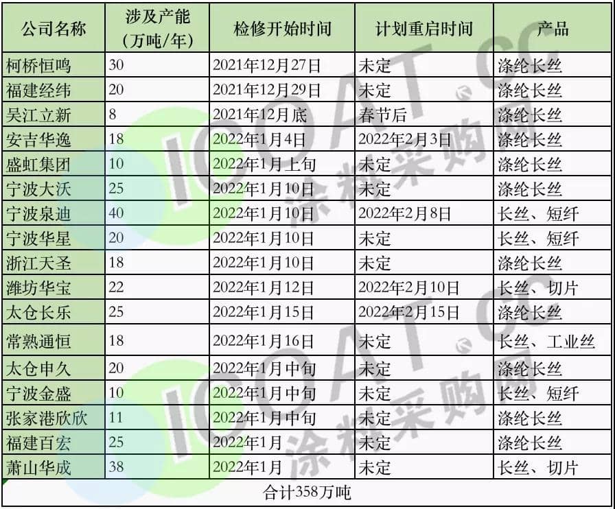 盡管2022開年不足一個月,但已有部分化工企業開啟了停車檢修的進程,涉及產量累計超過1000萬噸。值得注意的是,春節期間聚酯裝置檢修涉及長絲產能358萬噸。