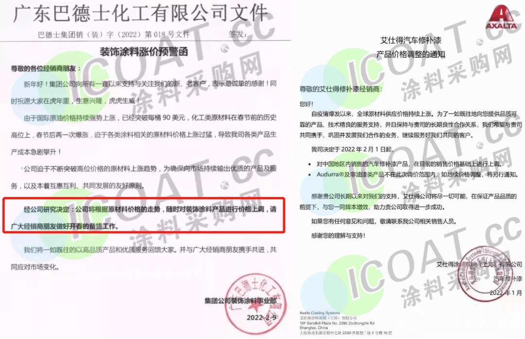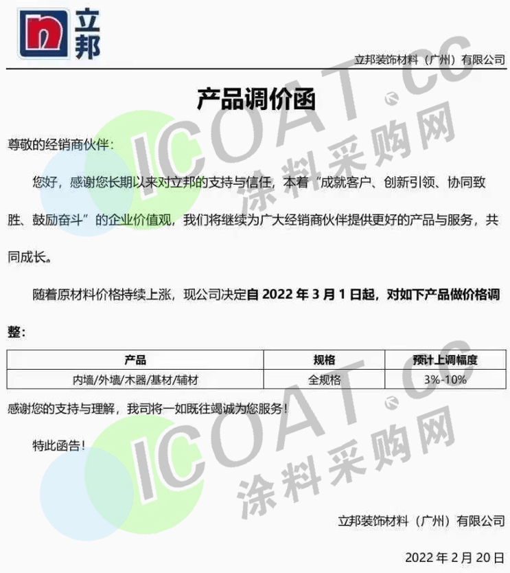 關西涂料:將于4月1日起實施漲價,最高上漲60%。BEHR:對BEHR百色熊在中國銷售的涂料產品的“經銷商供貨價(含稅)”及“建議零售價(含稅)”做出相應的調整。