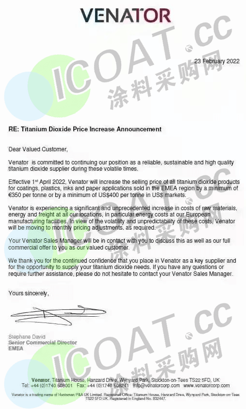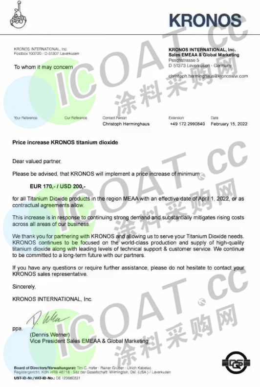 同期,康諾斯發函宣布,4月1日起,產品噸價上漲至少170歐元或200美元。
