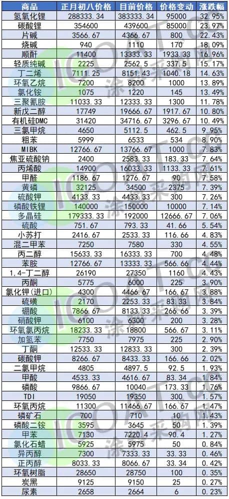 氫氧化鋰:目前報價383333.34元/噸,較年后開工價格上漲95000元/噸,漲幅32.95%。