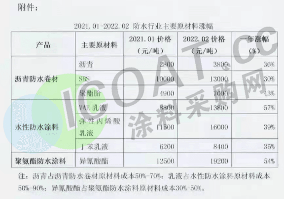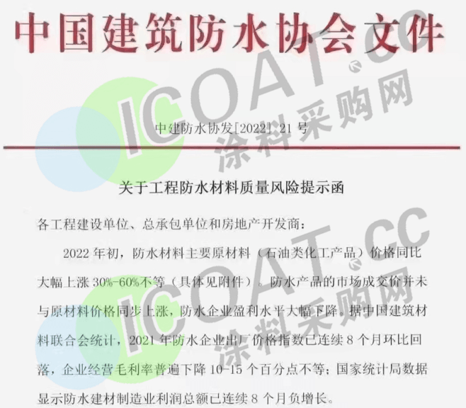 近日,中國建筑防水協(xié)會(huì)發(fā)布《關(guān)于工程防水材料質(zhì)量風(fēng)險(xiǎn)提示函》,稱2022年初,防水材料主要原材料(石油類化工產(chǎn)品)價(jià)格同比大幅上漲了30-60%不等,但成品市場交易價(jià)未同步上漲,導(dǎo)致企業(yè)毛利率下跌10-15個(gè)百分點(diǎn)。