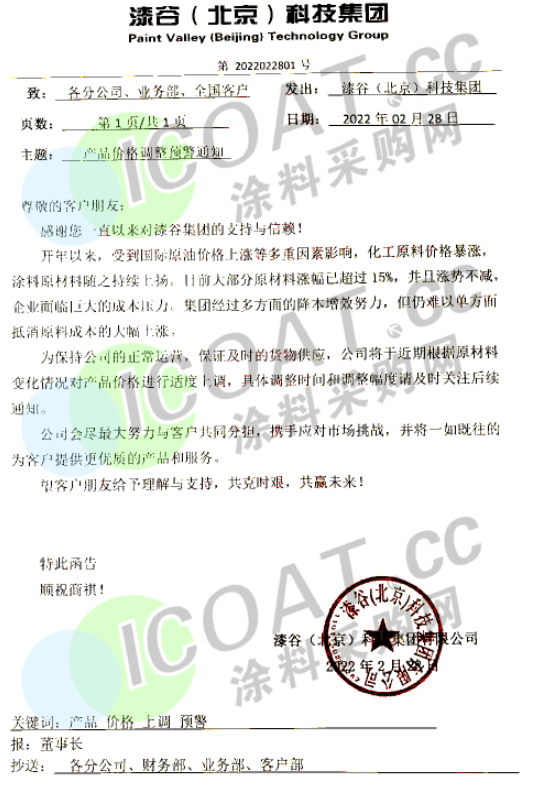 漆谷(北京)科技集團(tuán):將于近期根據(jù)原材料變化情況對(duì)產(chǎn)品價(jià)格進(jìn)行適度上調(diào)。