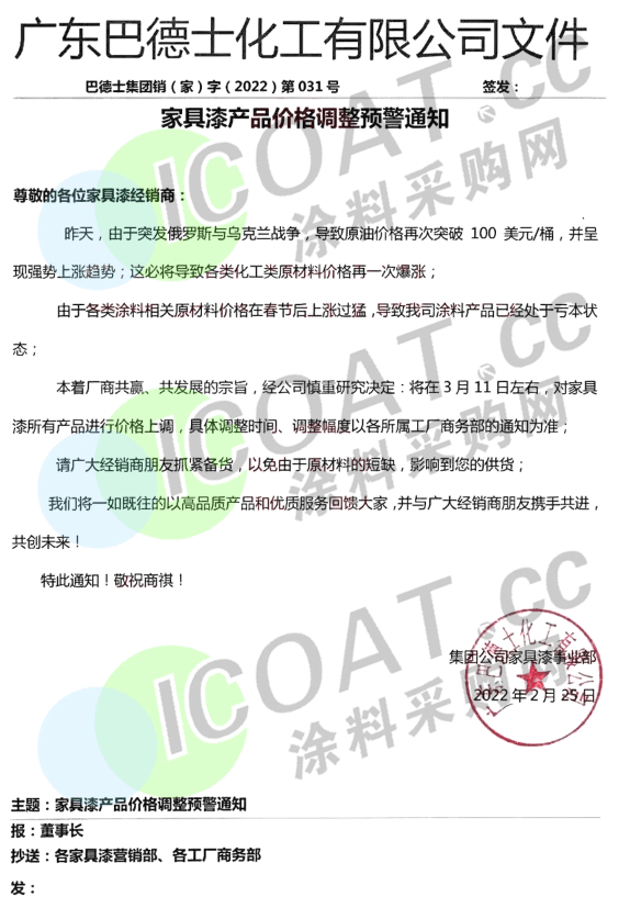 巴德士集團(tuán):3月11日左右,對(duì)家具漆所有產(chǎn)品進(jìn)行價(jià)格上調(diào)。