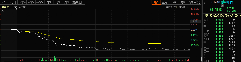 近日,合同銷售金額近6000億元的融創中國突然出現股債雙殺!開盤后就一路下殺,盤中跌幅超過17%,債券方面多筆殺跌,境內債“21融創03”跌10%,美元債“SUNAC 7 1/2 02/01/24”等跌幅超過6%。