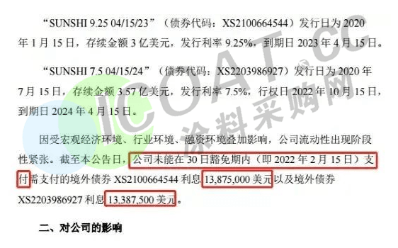 陽光城公告,存續規模分別為3億美元和3.57億美元的兩筆美元債未能在30日豁免期內(即2022年2月15日)支付利息,合計約2726萬美元(折合人民幣約1.73億元),構成實質性違約。