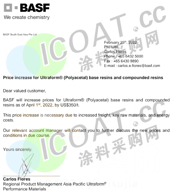 巴斯夫:自4月1日起,上調(diào)亞太地區(qū)的聚甲醛樹脂(POM)及復(fù)合樹脂的價格,未稅350美元/噸(約合人民幣含稅2500元/噸)。