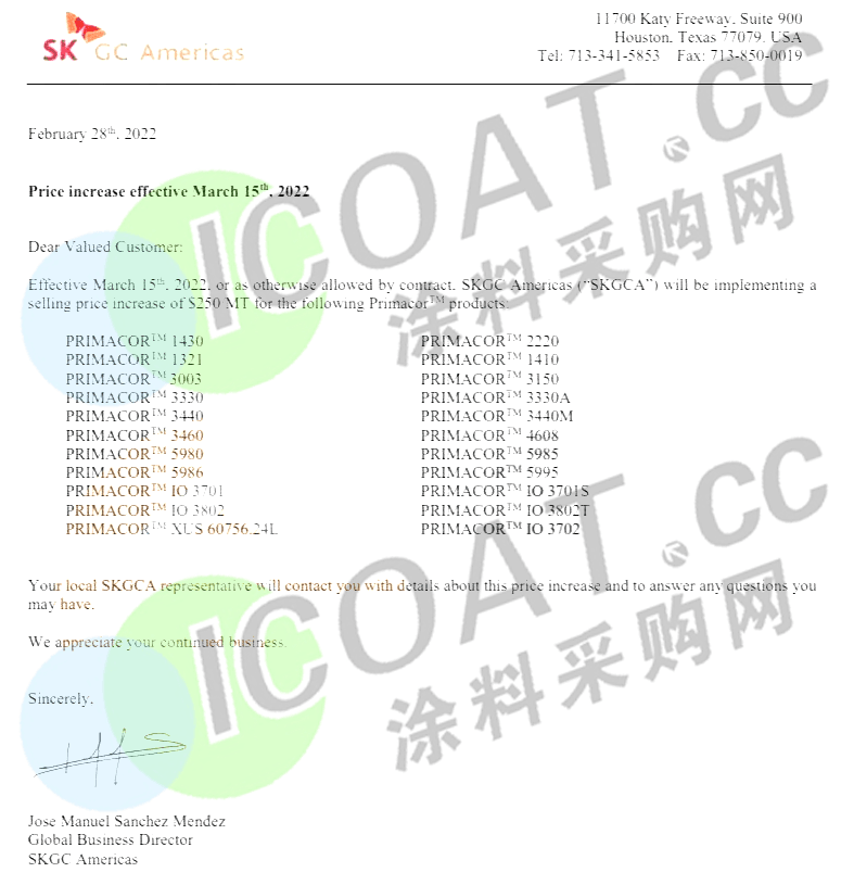 SKGC公司:3月15日起,將針對PRIMACOR™系列EAA產(chǎn)品進行全面提價,直接上漲250美元/噸(約合1577元/噸)。