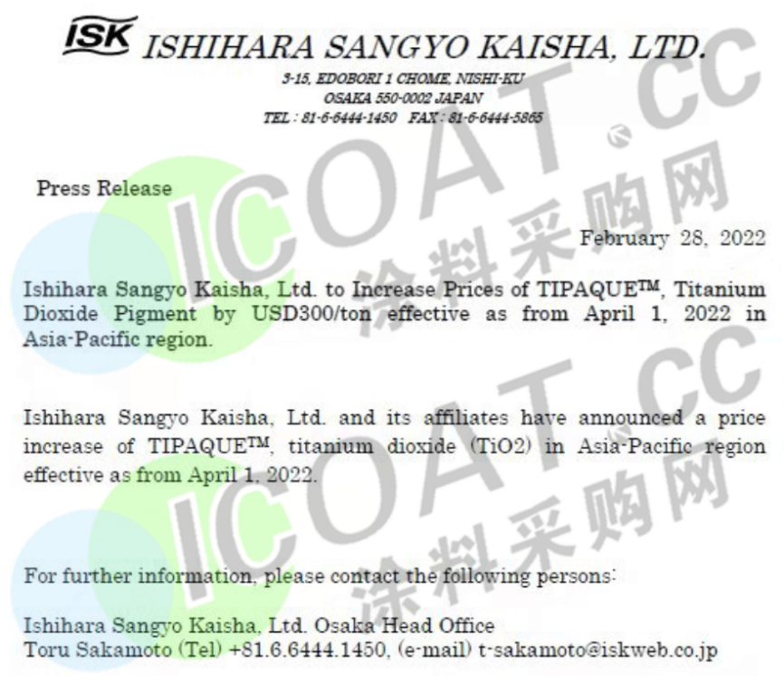 日本石原ISK:稱自4月1日起,TIPAQUE™系列鈦白粉價格上漲300美元/噸(約合1893元/噸)。