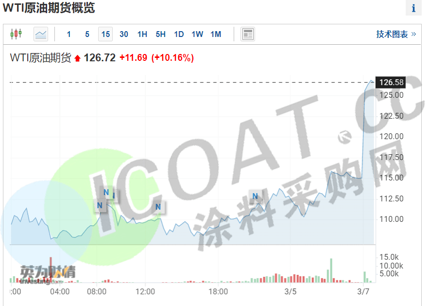 又一夜過去,俄烏戰(zhàn)況仍在持續(xù),國際原油的價格也在繼續(xù)沖刺。昨日(7日)美、布原油期貨開盤大漲,布倫特原油一度拉升20美元/桶,最高至138.02美元/桶,刷新2008年以來新高,WTI原油期貨突破130美元/桶。