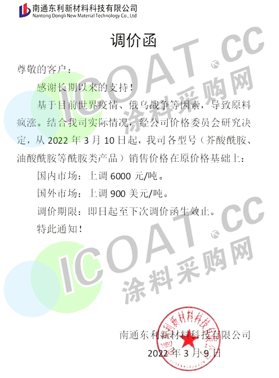 南通東利新材料:3月10日起,各型號(hào)(芥酸酰胺、油酸酰胺等酰胺類產(chǎn)品)銷售價(jià)格在原價(jià)格基礎(chǔ)上: