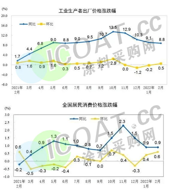 據(jù)國家統(tǒng)計(jì)局?jǐn)?shù)據(jù),2022年2月份,PPI同比上漲8.8%,環(huán)比上漲0.5%。國際原油價(jià)格大幅上漲,帶動(dòng)國內(nèi)石油相關(guān)行業(yè)價(jià)格上行,其中石油開采價(jià)格上漲13.5%,精煉石油產(chǎn)品制造價(jià)格上漲6.5%,有機(jī)化學(xué)原料制造價(jià)格上漲2.9%。CPI同比上漲0.9%,環(huán)比上漲0.6%,且剪刀差的現(xiàn)象已經(jīng)持續(xù)良久,這意味著疫情之下原材料價(jià)格飆升,企業(yè)生產(chǎn)成本居高不下,但卻無法將增加的成本全部通過產(chǎn)品加價(jià)轉(zhuǎn)移給終端消費(fèi)者。更直白地說就是,消費(fèi)端有效需求太少了,涂料、化工企業(yè)不敢隨意漲價(jià)!