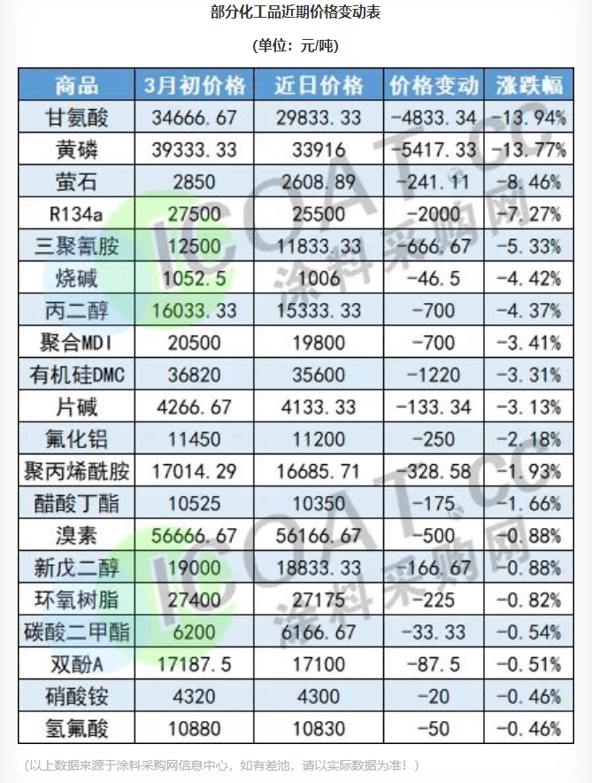 據(jù)涂料采購網(wǎng)了解,3月初以來,已經(jīng)有十幾種化工品呈現(xiàn)價(jià)格走低趨勢,不少企業(yè)也開始陸續(xù)下調(diào)產(chǎn)品報(bào)價(jià),包括年初曾瘋狂上漲的有機(jī)硅、黃磷、環(huán)氧樹脂、新戊二醇等化工品,近10余天的時(shí)間,價(jià)格下跌近5000元,讓人難免有些詫異。