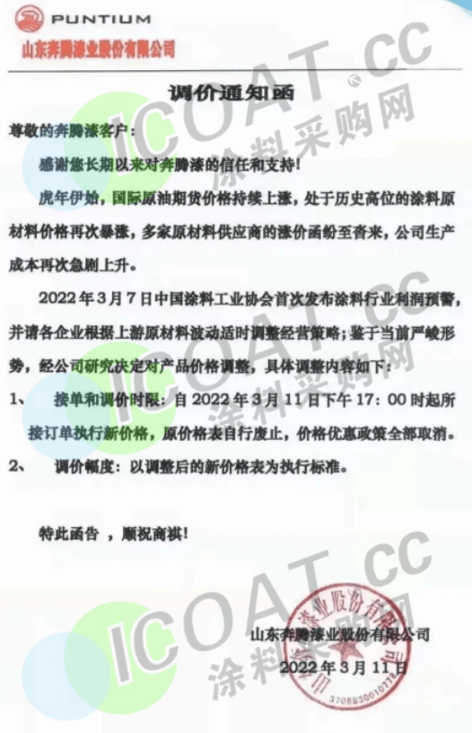 山東奔騰漆業:3月11日下午17:00時起所接訂單執行新價格,原價格表自行廢止,價格優惠政策全部取消。調價幅度以調整后的新價格表為執行標準。