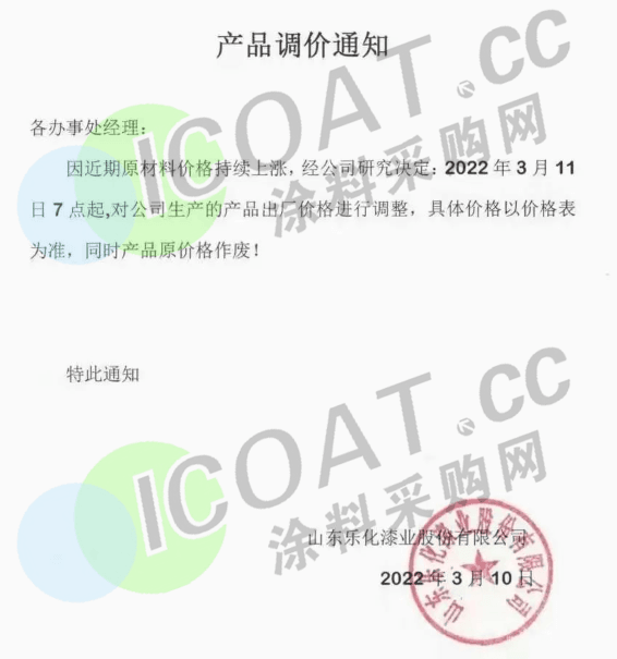 山東樂化漆業:3月11日7點起,產品出廠價格進行調整,具體價格以價格表為準。