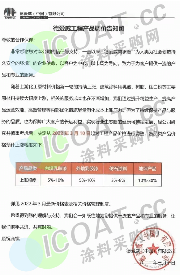 德愛威:工程產品價格上調,內墻乳膠漆上漲5-10%,外墻乳膠漆上漲5-10%,仿石涂料上漲3-8%,地坪產品上漲10-30%。