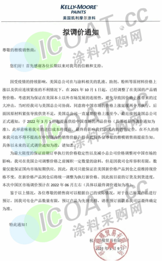 美國凱利摩爾涂料:美國總公司新價格產品到倉之前,中國區市場現有產品價格維持不變,新價格產品到倉后,統一執行新價格,調價預計在2022年6月左右(具體以最終調價通知為準)。