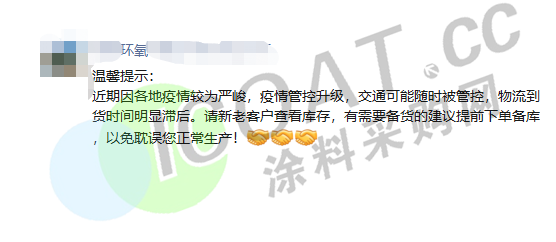 某環氧樹脂企業表示,交通可能隨時被管制,物流到貨時間明顯滯后,建議提前下單備貨。