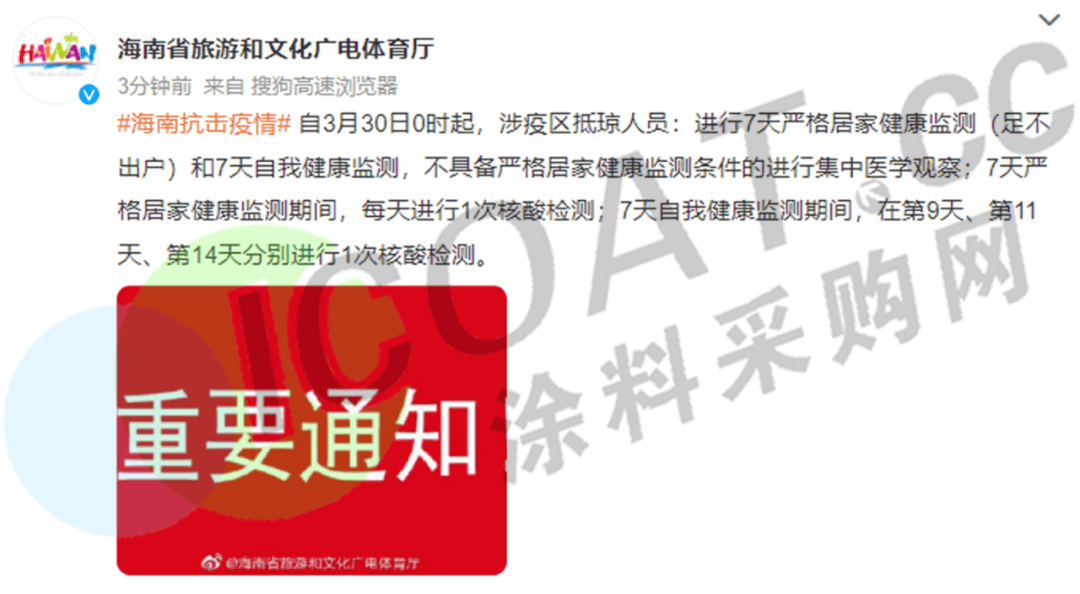 海南省表示,自3月30日0時(shí)起,涉疫區(qū)抵瓊?cè)藛T:進(jìn)行7天嚴(yán)格居家健康監(jiān)測(cè)(足不出戶)和7天自我健康監(jiān)測(cè),不具備嚴(yán)格居家健康監(jiān)測(cè)條件的進(jìn)行集中醫(yī)學(xué)觀察;7天嚴(yán)格居家健康監(jiān)測(cè)期間,每天進(jìn)行1次核酸檢測(cè)。