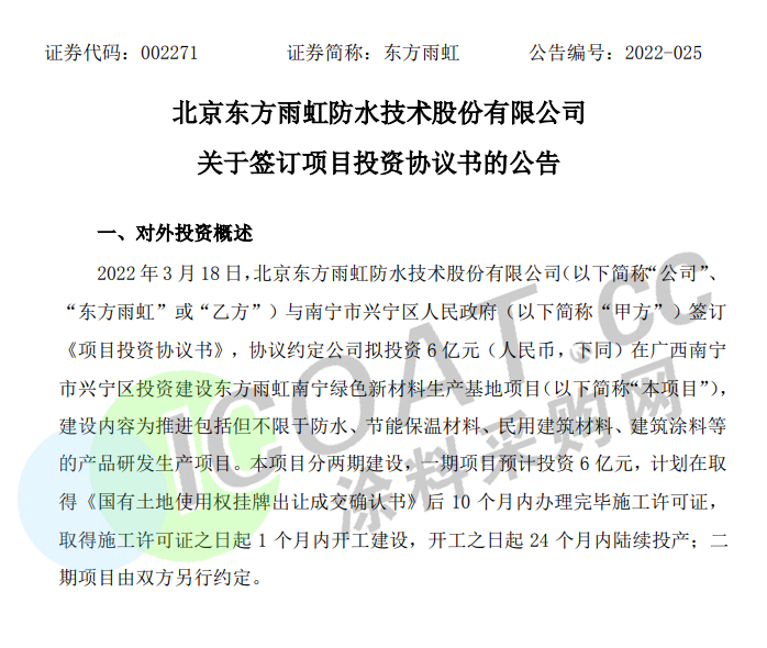 近日,“防水茅”東方雨虹宣布,將在廣西省南寧市興寧區計劃投資6億元,建設綠色新材料生產基地,主要推進包括但不限于防水、節能保溫材料、民用建筑材料、建筑涂料等產品研發生產項目。