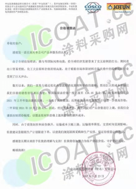 近日,中遠(yuǎn)佐敦船舶涂料(青島)有限公司發(fā)布價(jià)格調(diào)整函,稱近期全球疫情肆虐、俄烏國(guó)際局勢(shì)動(dòng)蕩,給全球經(jīng)濟(jì)發(fā)展帶來(lái)了史無(wú)前例的打擊,處于船舶市場(chǎng)和原材料市場(chǎng)夾縫中的船舶涂料行業(yè)受到了巨大沖擊,且原材料的巨大成本漲幅讓企業(yè)目前的銷(xiāo)售價(jià)格難以為繼,因此決定對(duì)產(chǎn)品價(jià)格進(jìn)行上調(diào)。