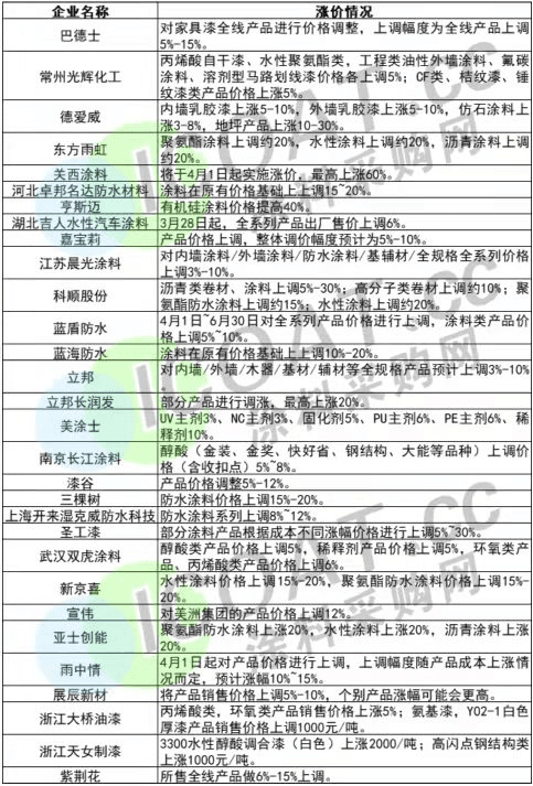 部分涂料企業(yè)漲價(jià)情況統(tǒng)計(jì)表
