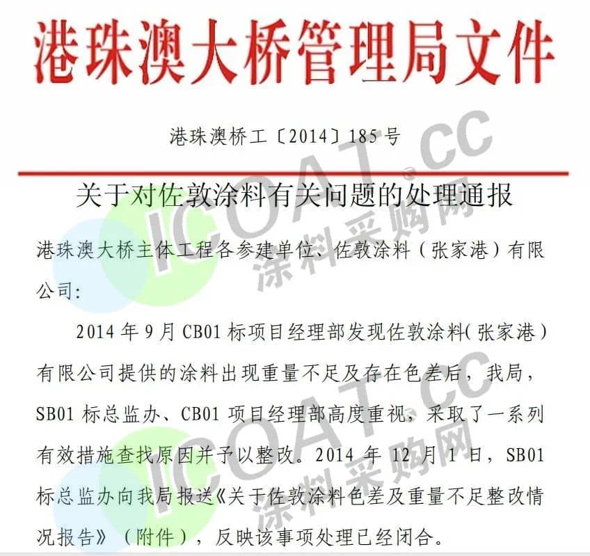 而在幾年前,港珠澳大橋還出現過另一次質量問題,源于涂料行業知名企業的涂刷作業。有網友向涂料采購網反映,某企鵝品牌涂料曾在港珠澳大橋工程中出現嚴重的質量問題,根據網友提供的港珠澳大橋管理局文件港珠澳橋工【2014】185號文件《關于對某某涂料有關問題的處理通報》顯示,2014年9月CB01標項目經理部發現某企鵝公司提供的涂料出現重量不足及存在色差以及涂層開裂現象,港珠澳大橋管理局SB01標總監辦、CB01項目經理部高度重視,采取了一系列有效措施查找原因并予以整改。