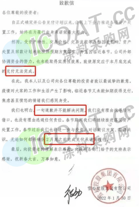 今年除夕,雪松控股董事長、創始人張勁帶來了一封致歉信,稱受各種因素影響,資產處置及回款計劃未能按照預期方案落實,公司外部協調資金的努力,也未能取得實質性效果,致使原本定應于本月底完成的兌付無法完成。